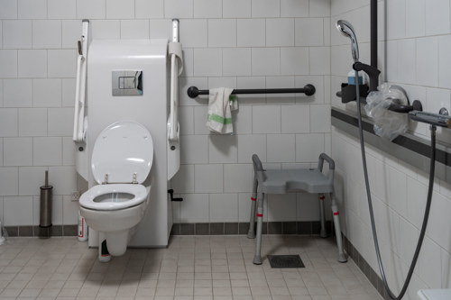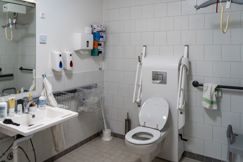 Badeværelset er stort nok til at have en hjælper med, hvis man har brug for hjælp til bad og toiletbesøg.