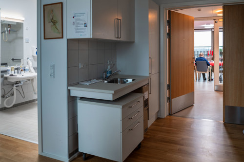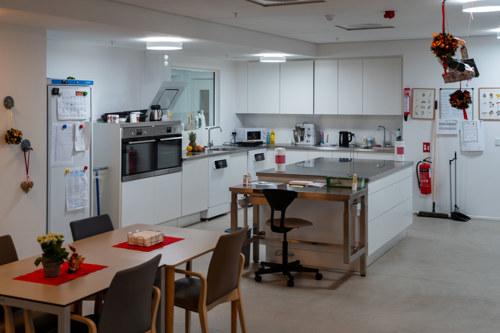 I det lille køkken er der vask og køleskab, så beboerne selv kan lave kaffe og the og have deres egne madvarer på køl, hvis de har lyst til mere end de fælles måltider.